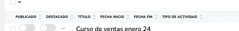 En los listados de cada sección, en la parte superior derecha, podemos encontrar el botón Crear En cada sección se completará con el tipo correspondiente "Crear Actividad", "Crear Galería"...