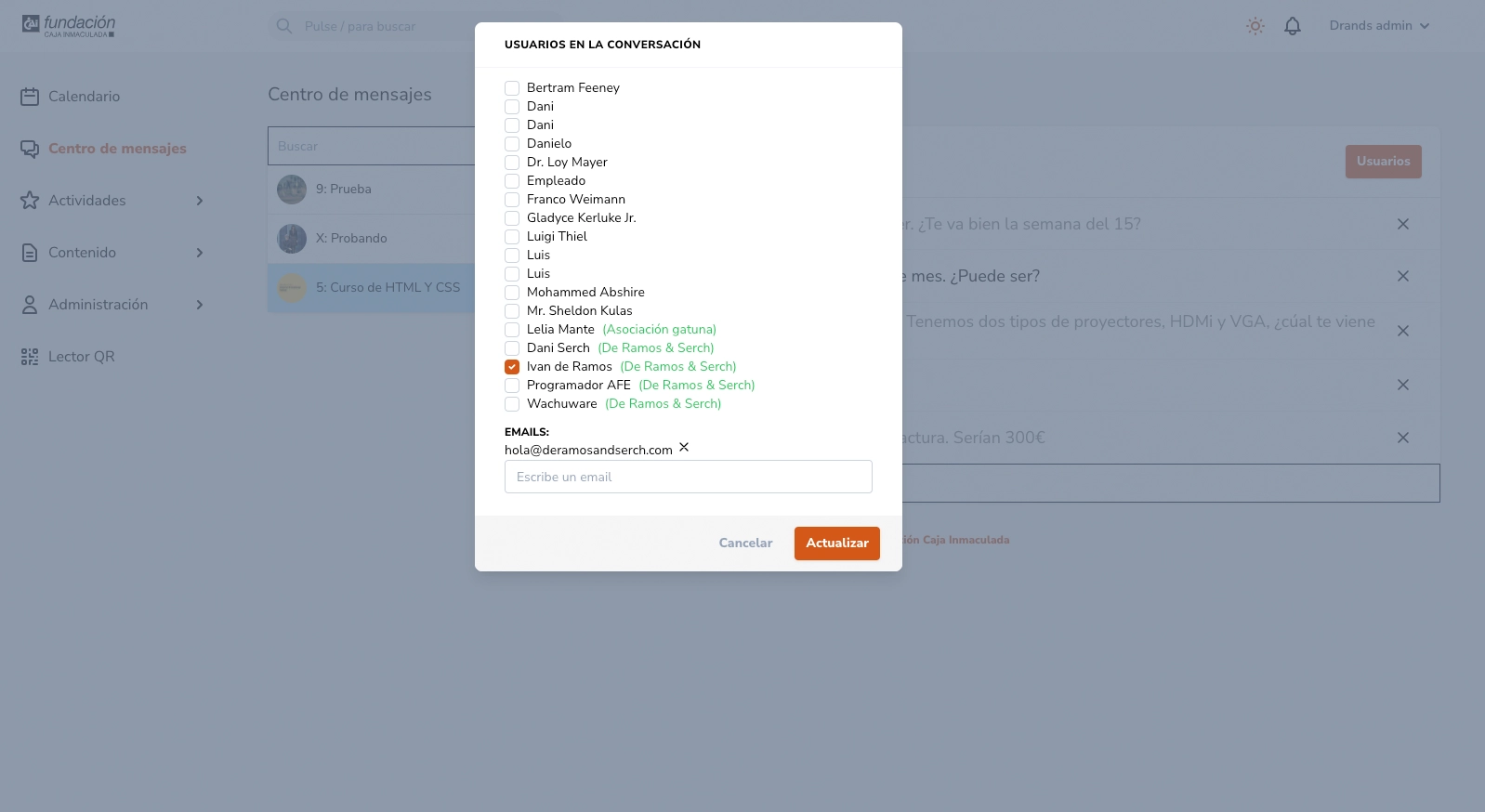 Podemos añadir usuarios a la conversación desde el botón superior derecho Usuarios. Estos pueden ser usuarios registrados e incluso mails externos. En ambos casos recibirán un mail al ser añadidos.